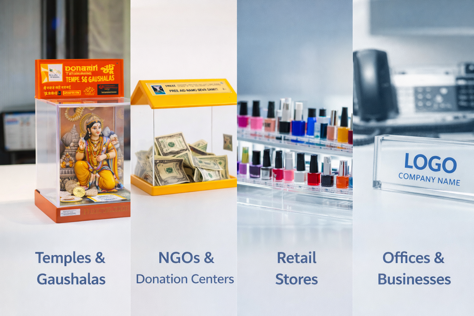 Acrylic products are widely used in temples, gaushalas, NGOs, donation centers, retail stores, offices, and businesses for donation boxes, display stands, sign boards, branding, organization,